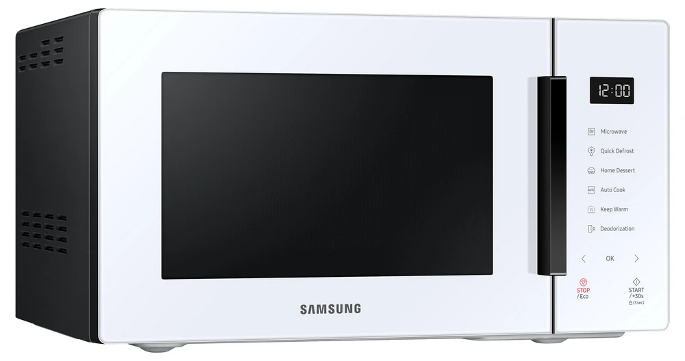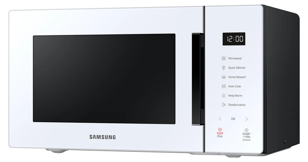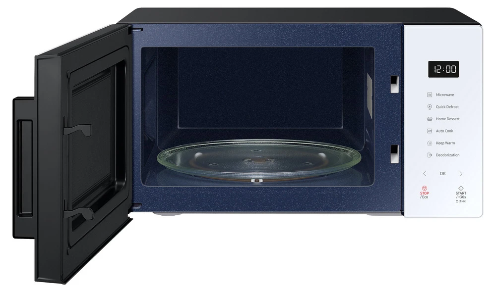 Mikrovlnná trouba s funkcí zdravého vaření • kapacita 23 l • výkon 800 W • extra odolný vnitřní keramický povrch • trojitý systém vedení tepla • 6 úrovní výkonu • Ø otočného talíře 28,8 cm • funkce rychlého rozmrazování • automatické programy & automatické vaření • eko mód • dětská pojistka • časovač • hodiny • Home Dessert • pohlcovač pachů • funkce udržování teploty • dotykový ovládací panel Glass Touch & Simple UX • rozměry: 27,5 × 48,9 × 36,3 cm (v × š × h) • Bespoke design