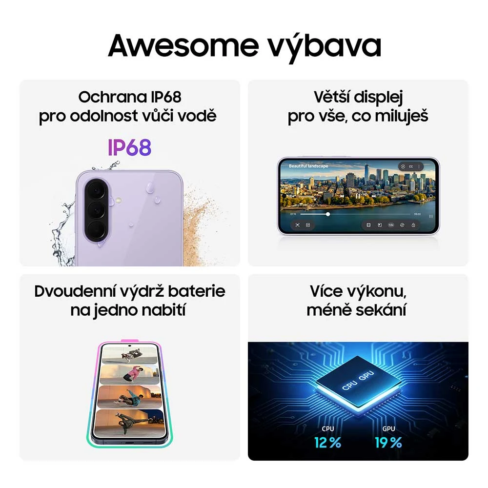 Mobilní telefon se 6,7" FHD+ SuperAMOLED displejem (2 340 × 1 080 px, 120Hz, 1200 nitů) • 8jádrový procesor Exynos 1480 • 6GB RAM • 128GB vnitřní úložiště • trojice zadních fotoaparátů – 50MPx (f/1,8) + 8MPx (f/2,2) + 5MPx (f/2,4) • OIS • přední 12MPx selfie kamera (f/2,2) • stereo reproduktory • optická čt. otisků • 5G • Wi-Fi 6 • Bluetooth 5.3 • NFC • GPS • USB-C • Dual SIM/eSIM • IP68 • 5 000mAh baterie s 45W rychlonabíjením • Android 16 • One UI 8.5 • barva: zelená