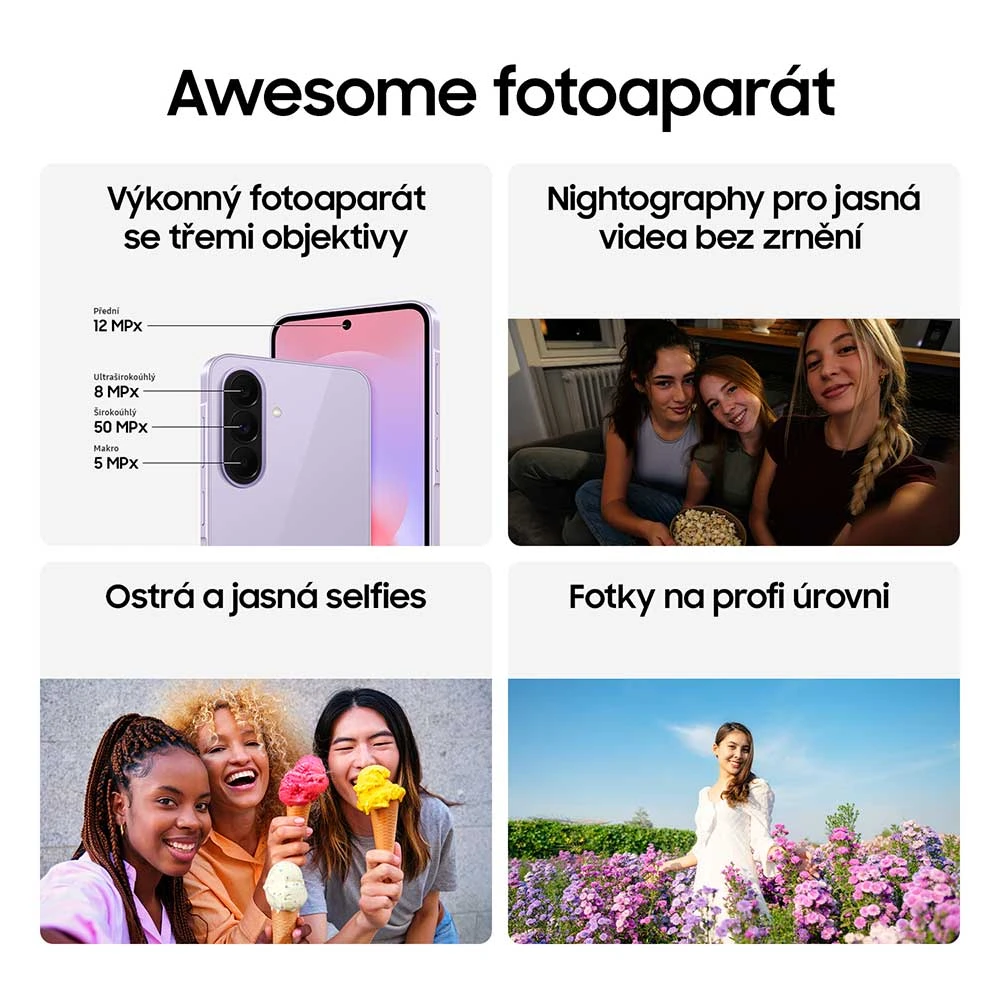 Mobilní telefon se 6,7" FHD+ SuperAMOLED displejem (2 340 × 1 080 px, 120Hz, 1200 nitů) • 8jádrový procesor Exynos 1480 • 8GB RAM • 256GB vnitřní úložiště • trojice zadních fotoaparátů – 50MPx (f/1,8) + 8MPx (f/2,2) + 5MPx (f/2,4) • OIS • přední 12MPx selfie kamera (f/2,2) • stereo reproduktory • optická čt. otisků • 5G • Wi-Fi 6 • Bluetooth 5.3 • NFC • GPS • USB-C • Dual SIM/eSIM • IP68 • 5 000mAh baterie s 45W rychlonabíjením • Android 16 • One UI 8.5 • barva: fialová