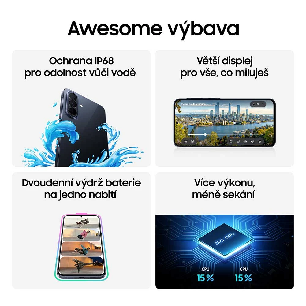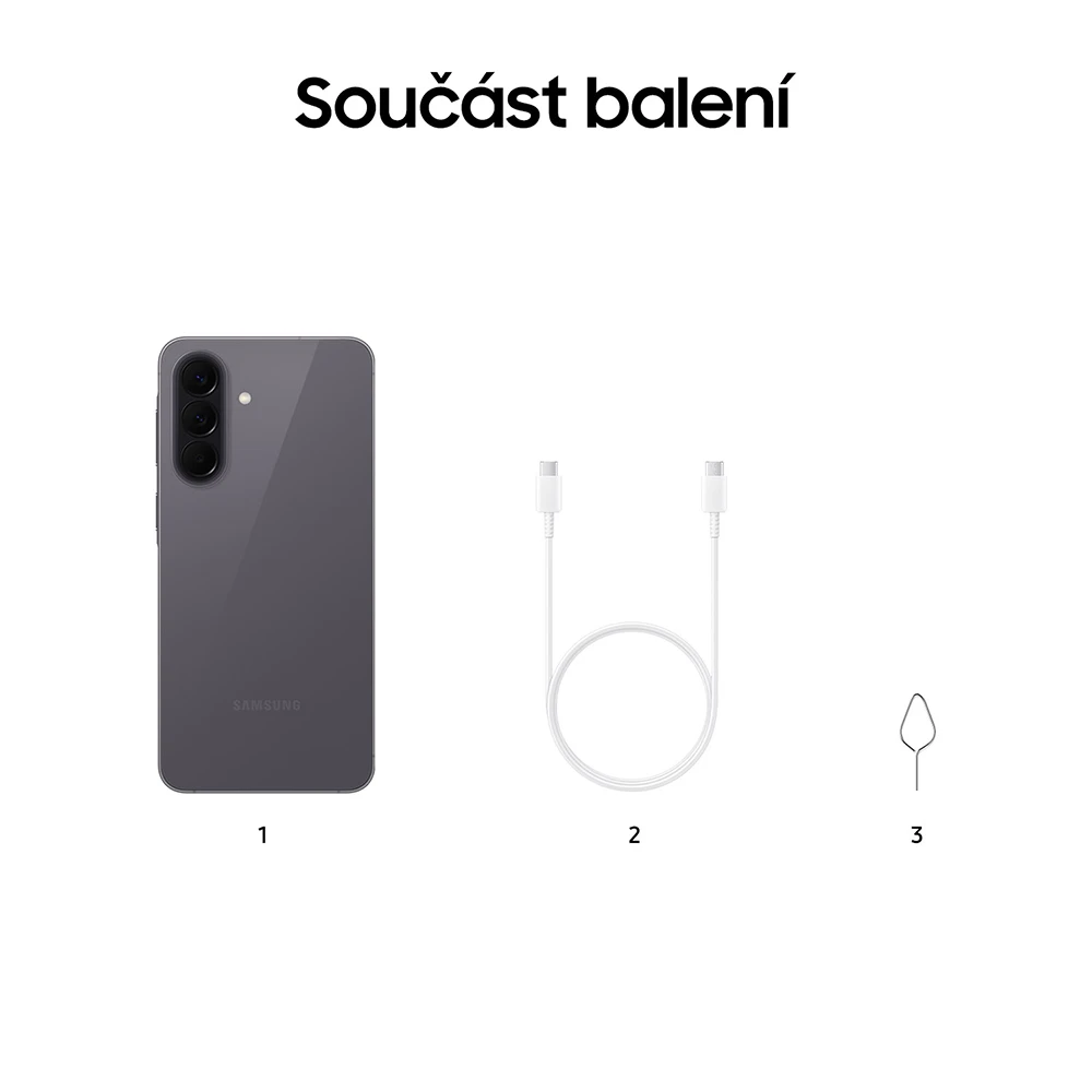 Mobilní telefon se 6,7" FHD+ SuperAMOLED displejem (2 340 × 1 080 px, 120Hz, 1200 nitů) • 8jádrový procesor Exynos 1680 • 8GB RAM • 256GB vnitřní úložiště • trojice zadních fotoaparátů – 50MPx (f/1,8) + 12MPx (f/2,2) + 5MPx (f/2,4) • OIS • přední 12MPx selfie kamera (f/2,2) • stereo reproduktory • optická čt. otisků • 5G • Wi-Fi 6E • Bluetooth 6.0 • NFC • GPS • USB-C • Dual SIM/eSIM • IP68 • 5 000mAh baterie s 45W rychlonabíjením • Android 16 • One UI 8.5 • barva: šedá