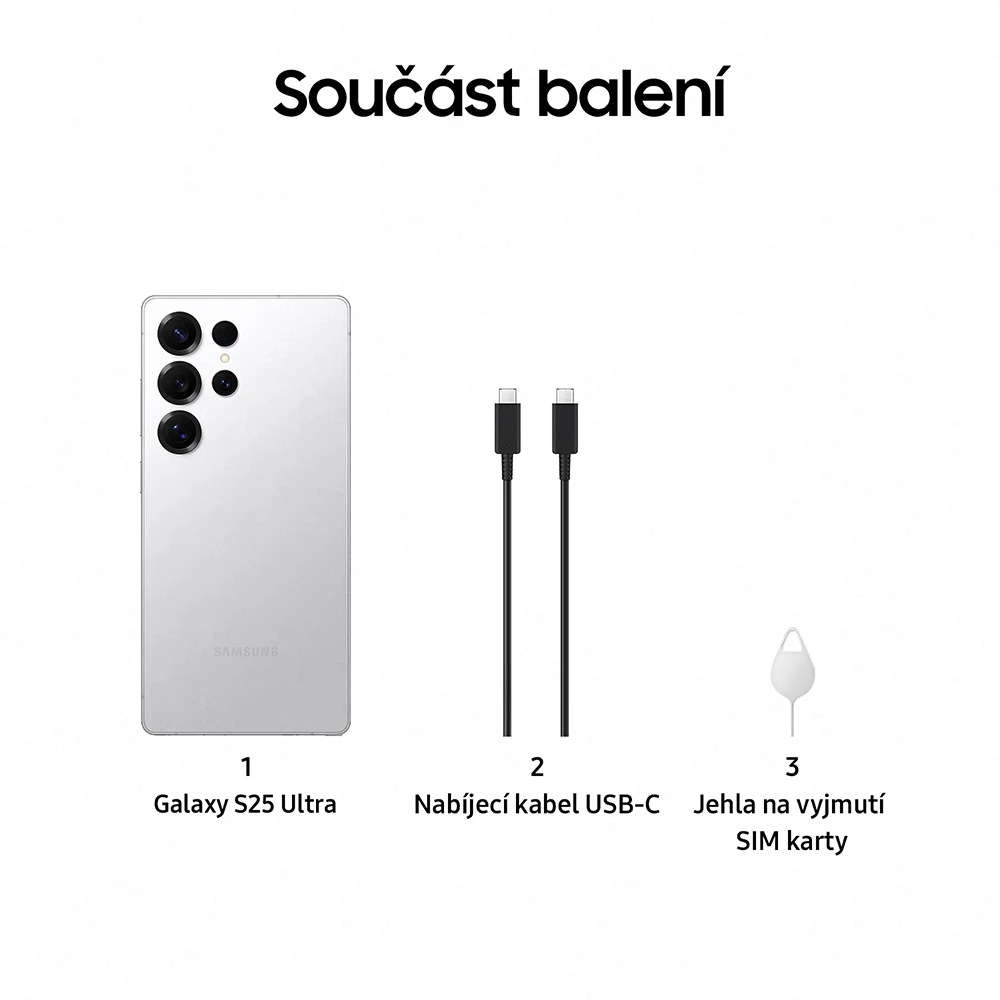 Mobilní telefon s 6,9" Quad HD+ Dynamic LTPO AMOLED 2X displejem (3120×1440 px,1-120Hz,HDR10+,až 2600 nitů) • 8jádr. pr. Snapdragon 8 Elite • 12GB RAM • 512GB úložiště • čtveřice zadních fotoap. - 200MP (f/1,7)+10MP (f/2,4)+50MP (f/1,9)+50MP (f/3,4) • OIS • přední 12MP kamera (f/2,2) • S Pen • stereo reprod. • ultrazvuk. čt. otisků • 5G • Wi-Fi 7 • Bluetooth 5.4 • NFC • GPS • USB-C 3.2 • UWB • IP68 • 5 000mAh bat. s 45W drát. a 25W bezdr. nab. • Android 15 • Sams. DeX • barva: stříbrná