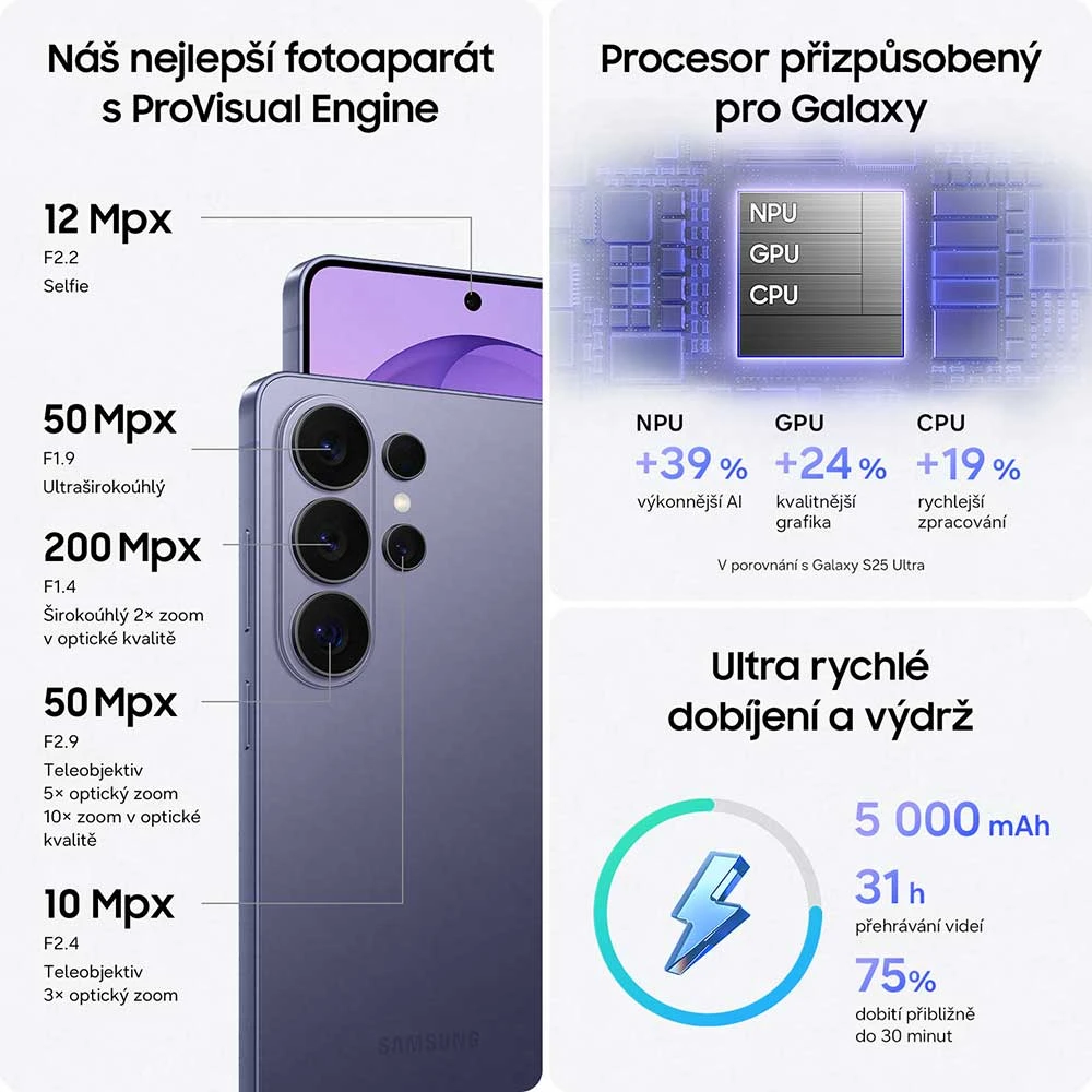 Mobilní telefon s 6,9" Quad HD+ Dynamic LTPO AMOLED 2X displejem (3120×1440 px,1-120Hz,HDR10+,až 2600 nitů) • 8jádr. pr. Snapdragon 8 Elite Gen5 for Sam • 12GB RAM • 256GB úložiště • čtveřice zadních fotoap. - 200MP (f/1,4)+10MP (f/2,4)+50MP (f/1,9)+50MP (f/2,9) • OIS • přední 12MP kamera (f/2,2) • S Pen • stereo reprod. • ultrazvuk. čt. otisků • 5G • Wi-Fi 7 • BT 6.0 • NFC • GPS • USB-C 3.2 • UWB • IP68 • 5 000mAh bat. s 60W drát. a 25W bezdr. nab. Qi2 • Android 16 • Sams. DeX • barva: černá