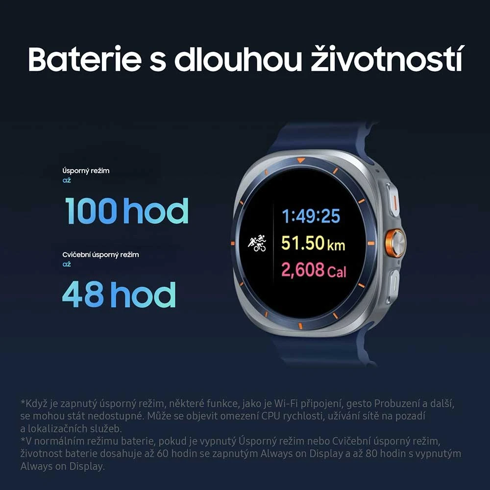 S úchvatnými Galaxy Watch Ultra (2025) můžeš klidně vyrazit do nepohody. Největší model Watch je z velké části vyrobený z titanu a nadchne výjimečnou odolností, kterou stvrzují stupně ochrany MIL-STD-810H, IP68 a také 10 ATM. S hodinkami se klidně na chvíli vydej až do stometrové hloubky, ale poradí si také s teplotami −20 až 55 °C, takže pokud neholduješ vodě, mohou tě doprovázet na velehoru nebo třeba do pouště. Dobrodruhy a cestovatele potěší také dvojité GPS, sportovci ocení možnost přepínat sporty Akčním tlačítkem (režim Multisport). Unikátní výbavu modelu Ultra představuje také hlasitá, 86dB bezpečnostní siréna, pomocí které můžete v případě nouze přivolat pomoc.