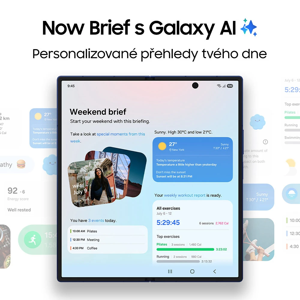 Z Fold7 vstupuje na trh se zbrusu novým One UI 8, jež je založené na Androidu 16. Těšit se ale můžeš na 7 let oficiální softwarové podpory a 7 nových verzí OS. Systém nadchne ultrapokročilou umělou inteligencí, která umí chytře pracovat s informacemi v různém kontextu a je ještě lépe optimalizovaná tak, aby naplno využila obrovskou vnitřní obrazovku. Sdílej s Gemini Live obsah displeje a zadávej mu pokyny jednoduše hlasem. Samozřejmě zůstávají také oblíbené funkce, jako je Vyhledávání zakroužkováním, kdy přes Google snadno vyhledáš cokoli, co právě vidíš na displeji. Zvláštní zmínku si zaslouží pokročilé (mj. generativní) úpravy fotografií a chytré možnosti editace videa, jako je odfiltrování rušivých frekvencí zvuku.