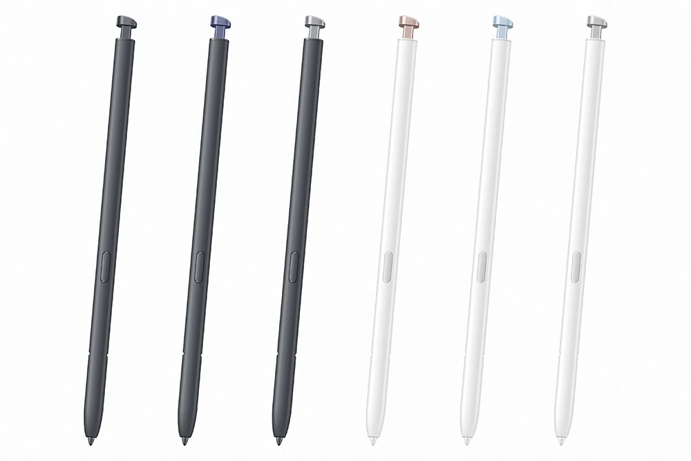 Nová generace pera S Pen pro Galaxy S26 Ultra • 4 096 úrovní přítlaku s vylepšenou podporou náklonu pro stínování • Certifikace IP68 • Napájení je pasivní (pero nevyžaduje nabíjení pro psaní a kreslení) • Latence 2,1 ms • dvoutónový design - pouze horní část (čepička), která vyčnívá z těla telefonu, je barevně sladěna s šasi telefonu
