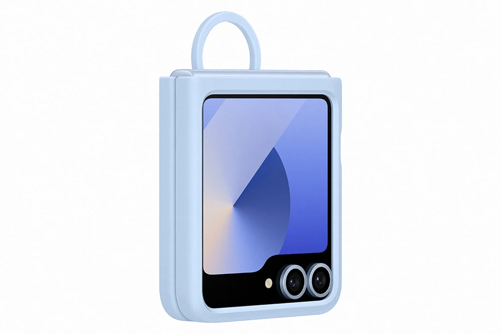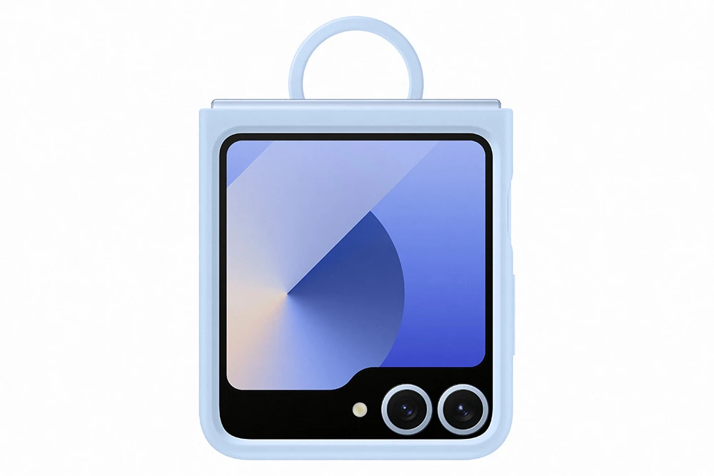 Zadní kryt s držátkem pro Galaxy Z Flip6 • dvoudílné pouzdro z měkkého silikonu v matném a funkčním provedení • tenký, šikovný a pohodlný zároveň • komfortní a bezpečné držení s držákem prstenu • ochrana rámu a zadní části před poškrábáním a nárazy • ekologické - částečně vyrobeno z recyklovaných materiálů • barva: světle modrá