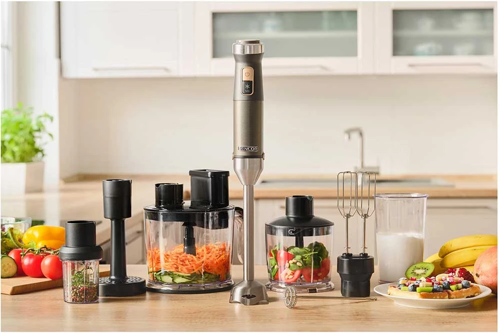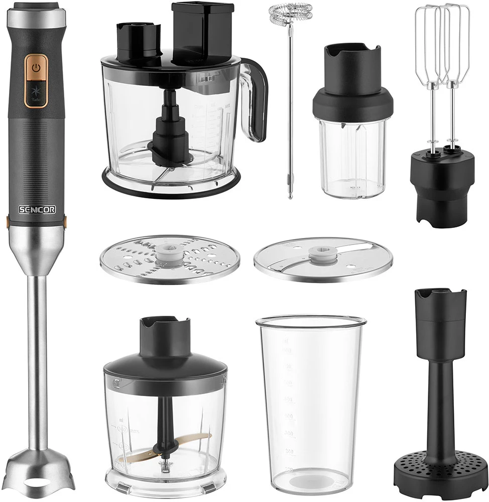 šlehač, mačkač brambor, nerezový mixér, kuchynský robot s 2 noži z nerezové oceli,nádoba o objemu 1,5 l