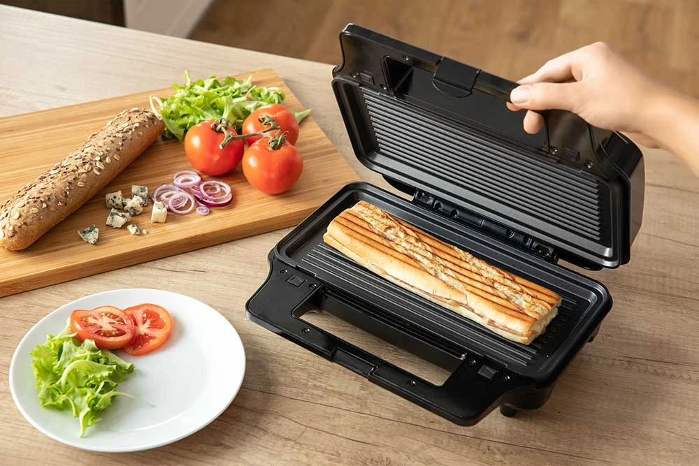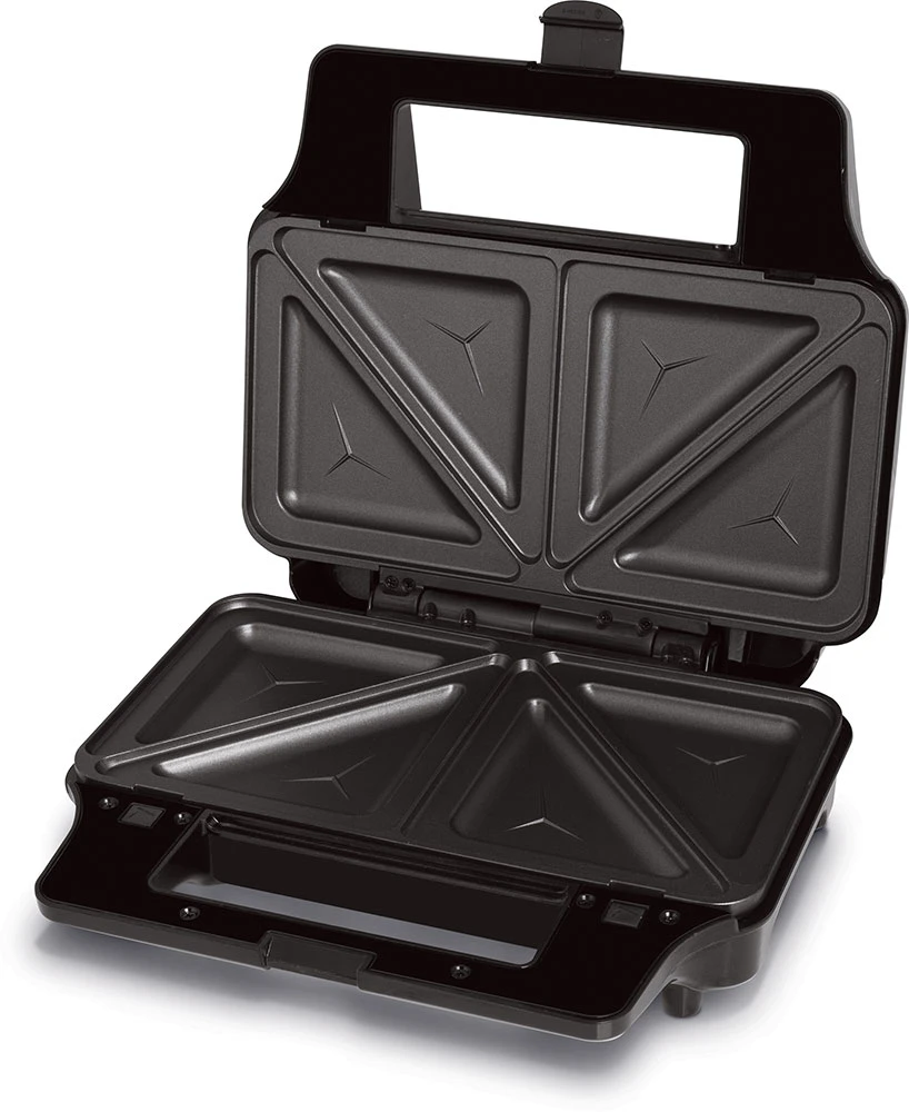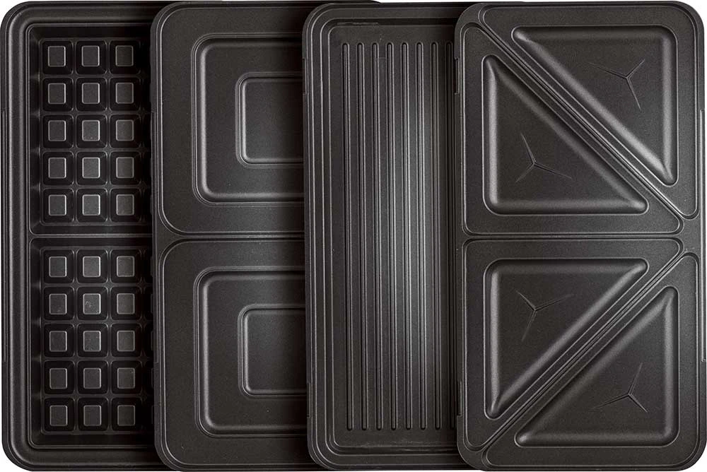 Sendvičovač (4 v 1) • 4 výměnné desky na pečení: toasty v trojúhelníkovém tvaru, tousty čtvercové, vafle, panini/bagety • elegantní metalický vzhled • snadné ovládání • nepřilnavý povrch desek pro snadnou údržbu • tepelně izolované rukojeti