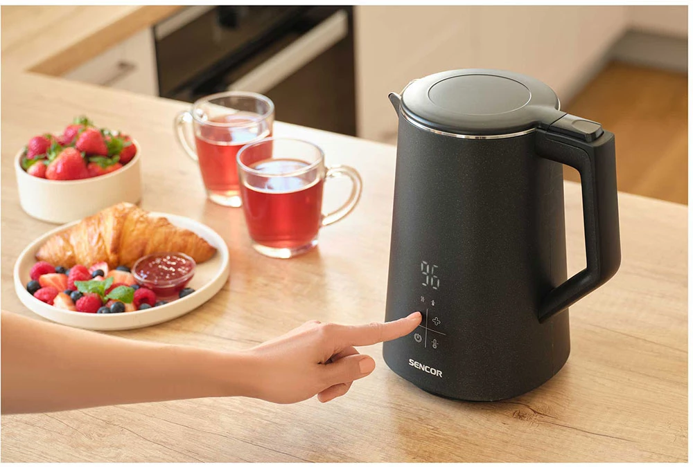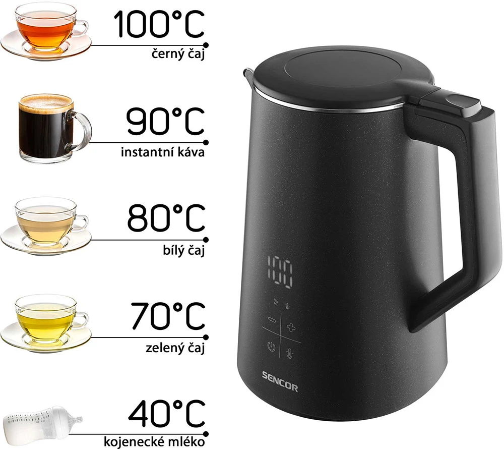 Dvoustěnná rychlovarná konvice • 1,7 l objem • vysoký výkon 2 200 W • zesílený dvojitý plášť Cool Touch • nastavení teploty vody v rozsahu 40-100 °C • funkce Keep Warm • ovládání přes dotykový LED displej • trojitý bezpečnostní systém • otočná základna o 360° s konektorem Strix • vyjímatelné nerezové sítko pro zachycení nečistot z vodního kamene • elegantní černý povrch