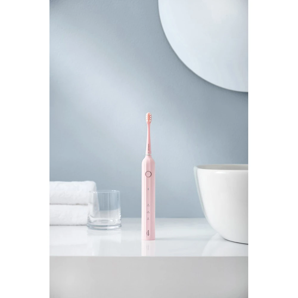 Sonický elektrický zubní kartáček • brilantní péče o ústní dutinu • až 38 000 ot./min • špičkové štětiny DuPont Tynex • 3 nastavitelné režimy – bělení zubů, standardní nebo extra jemné čištění • technologie mikrobublinek • čištění povlaku jazyka • 3úrovňový LED displej • certifikace FDA • krytí IPX7 • tichý provoz • až 180denní výdrž na baterii (doba nabíjení 5 h) • jedinečný design připomínající románskou architekturu • barva: růžová