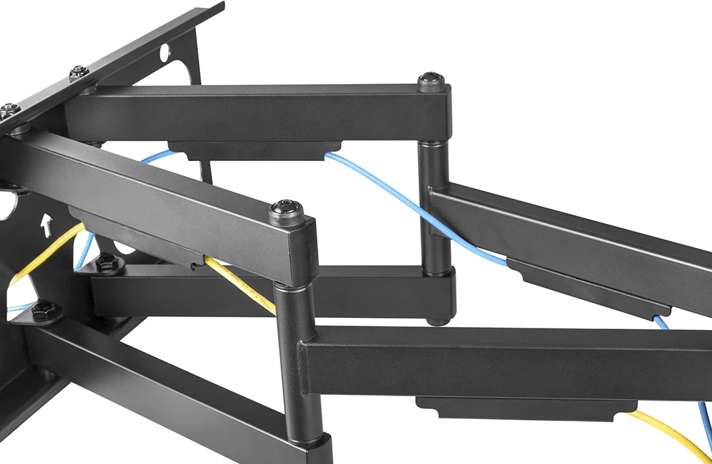 Výsuvný polohovatelný držák na TV • min. úhlopříčka je 50" • max. úhlopříčka je 100" • náklon nahoru: +5° • náklon dolu: -15° • natočení: +/-60° • korekce roviny: +/-3° • minimální rozteč: 200x200 mm • maximální rozteč: 600x600 mm • min. vzdálenost od zdi: 6,9 cm • max. vzdálenost od zdi: 63 cm • maximální nosnost až 80 kg • materiál: ocel • barva: černá