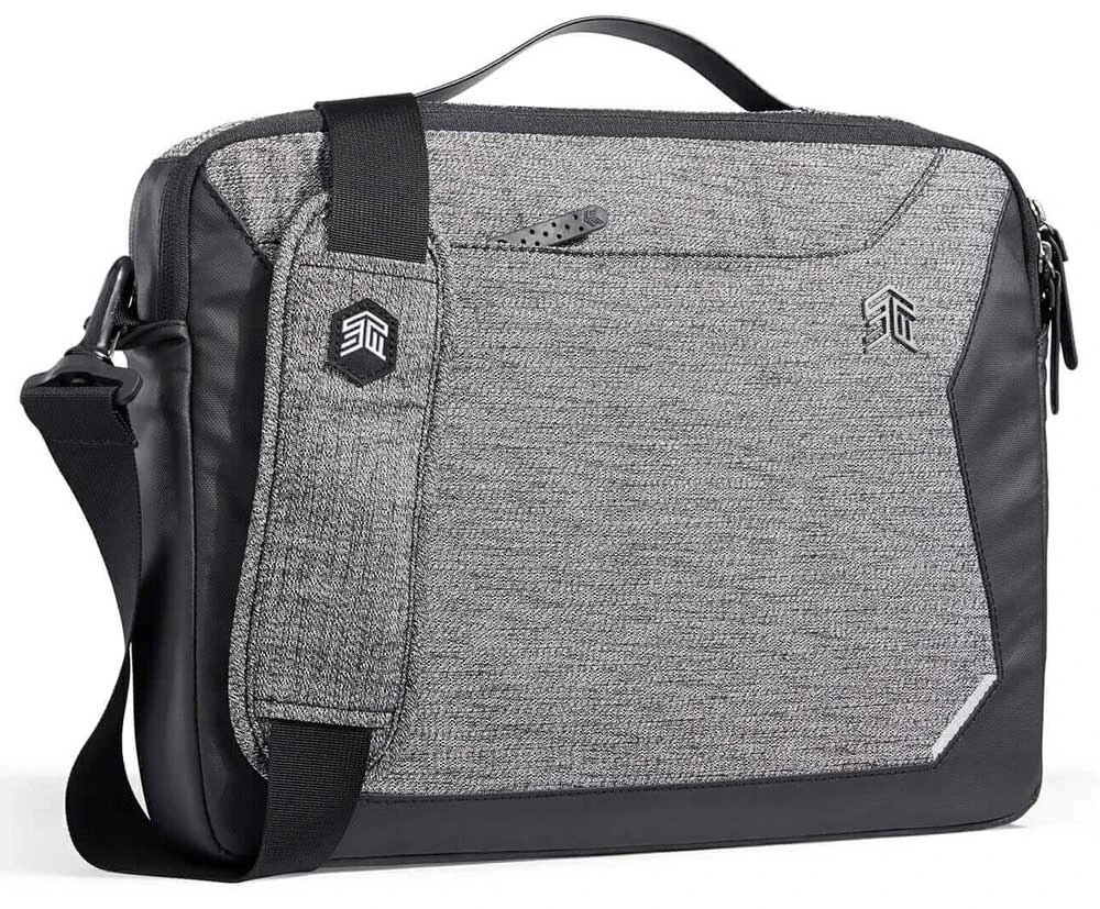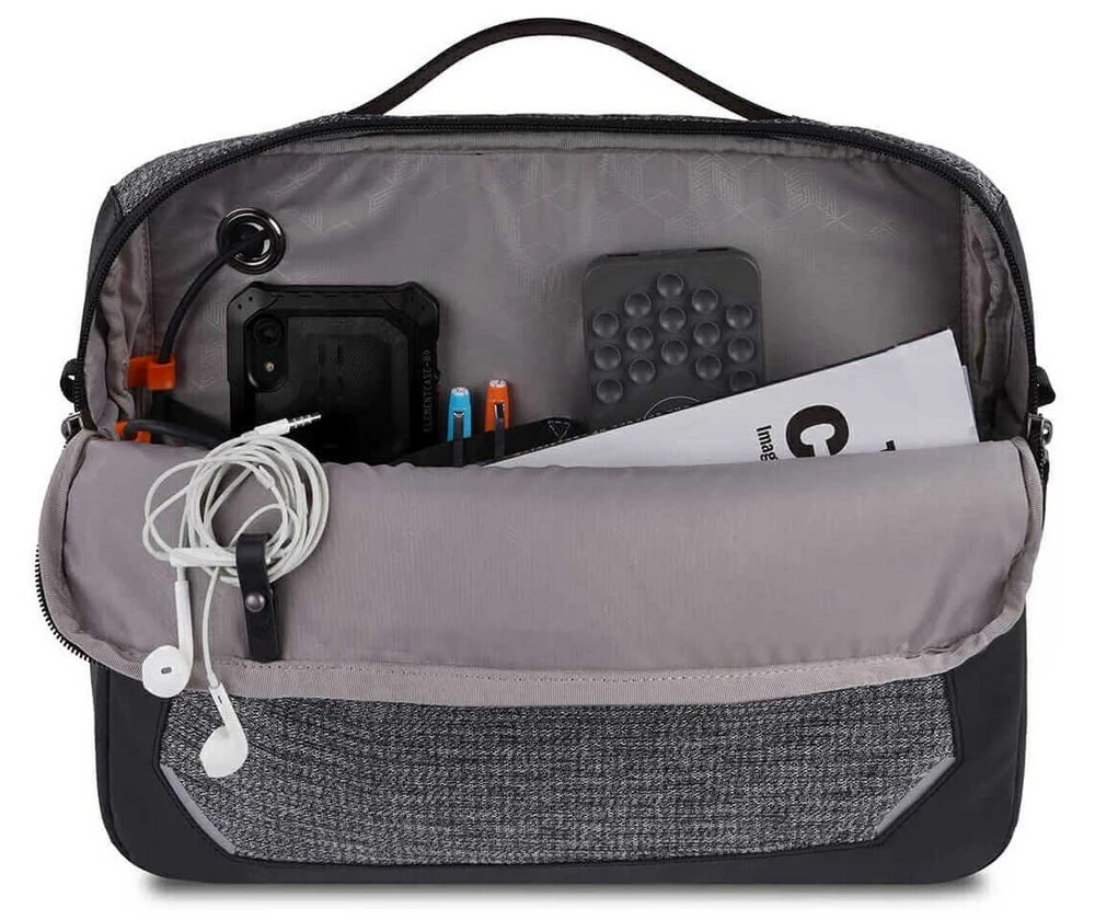 Taška přes rameno pro notebook s uhlopříčkou 13-14" • speciální kapsa na AirPod pro rychlý přístup • TPU potažené popruhové rukojeti s nýty zajišťují odolnost • vodoodpudivý povlak C6DWR aplikovaný na tkaninu • systém zadního panelu Air Channel podporuje proudění vzduchu• 100% polyester • rozměry: V 27 x Š 37 x H 6 cm • objem: 7,0l • barva: žíhaná šedá
