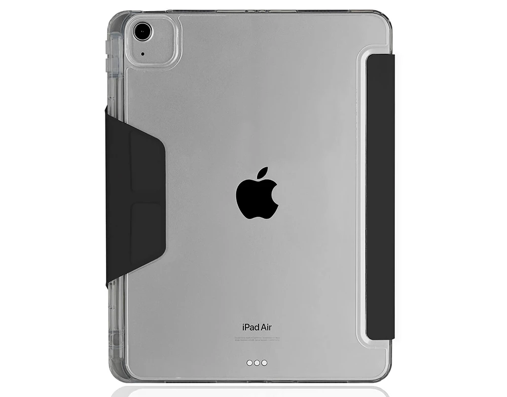 Ultra tenké ochranné pouzdro pro iPad Air 11″ M2/5th/4th gen • důmyslný skládací kryt ve stylu origami, co ukrývá funkci vertikálního nebo horizontálního stojánku • brilantní rezistence vůči pádům, nárazům a poškrábání • transparentní, křišťálově čistá zadní strana nechávající vyniknout ikonický design iPadu • neomezený přístup ke všem portům a tlačítkům tabletu • integrovaný držák pro Apple Pencil • materiál: TPU, PC a PU • barva: černá
