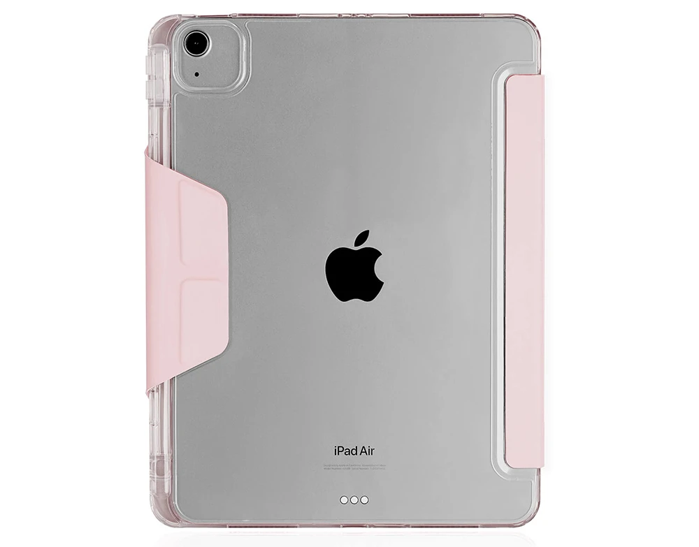 Ultra tenké ochranné pouzdro pro iPad Air 11″ M2/5th/4th gen • důmyslný skládací kryt ve stylu origami, co ukrývá funkci vertikálního nebo horizontálního stojánku • brilantní rezistence vůči pádům, nárazům a poškrábání • transparentní, křišťálově čistá zadní strana nechávající vyniknout ikonický design iPadu • neomezený přístup ke všem portům a tlačítkům tabletu • integrovaný držák pro Apple Pencil • materiál: TPU, PC a PU • barva: růžová