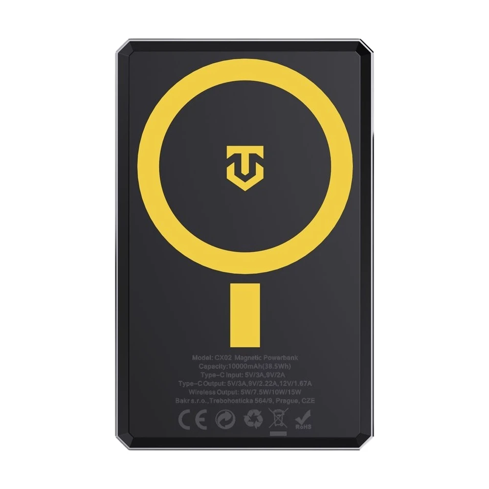 Kapacita 10000 mAh • Bezdrátové nabíjení 15 W (kompatibilní s MagSafe a Qi) • Rychlé nabíjení PD (cca 20 W přes USB-C) • USB-C vstup: 5V/3A, 9V/2A • USB-C výstup: 5V/3A, 9V/2.22A, 12V/1.67A • Pevná, odolná konstrukce (hliník, guma, ABS) • 9stupňová bezpečnostní ochrana • Lehká a tenká (196 g, tloušťka 15 mm) • Indikátor nabití: LED indikace