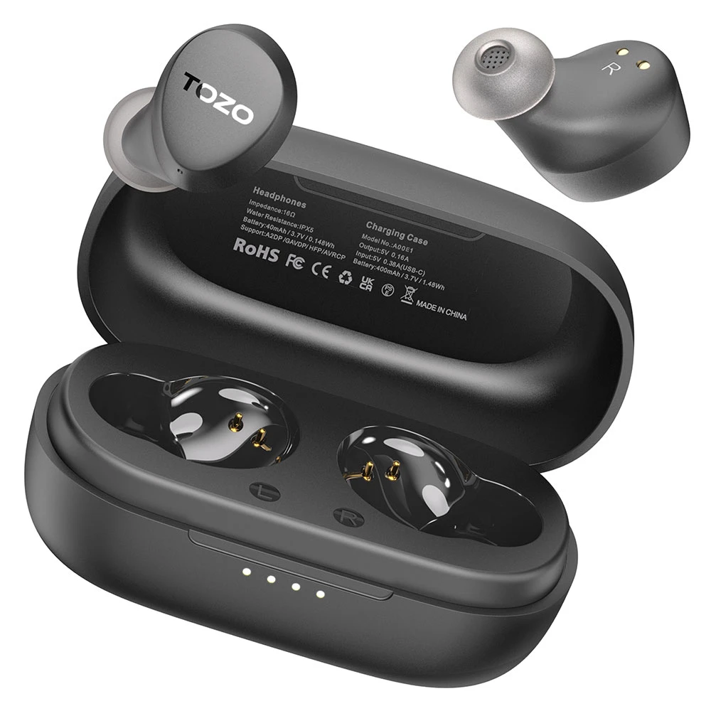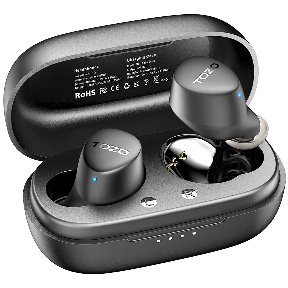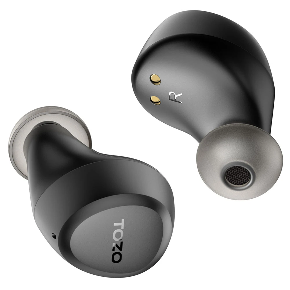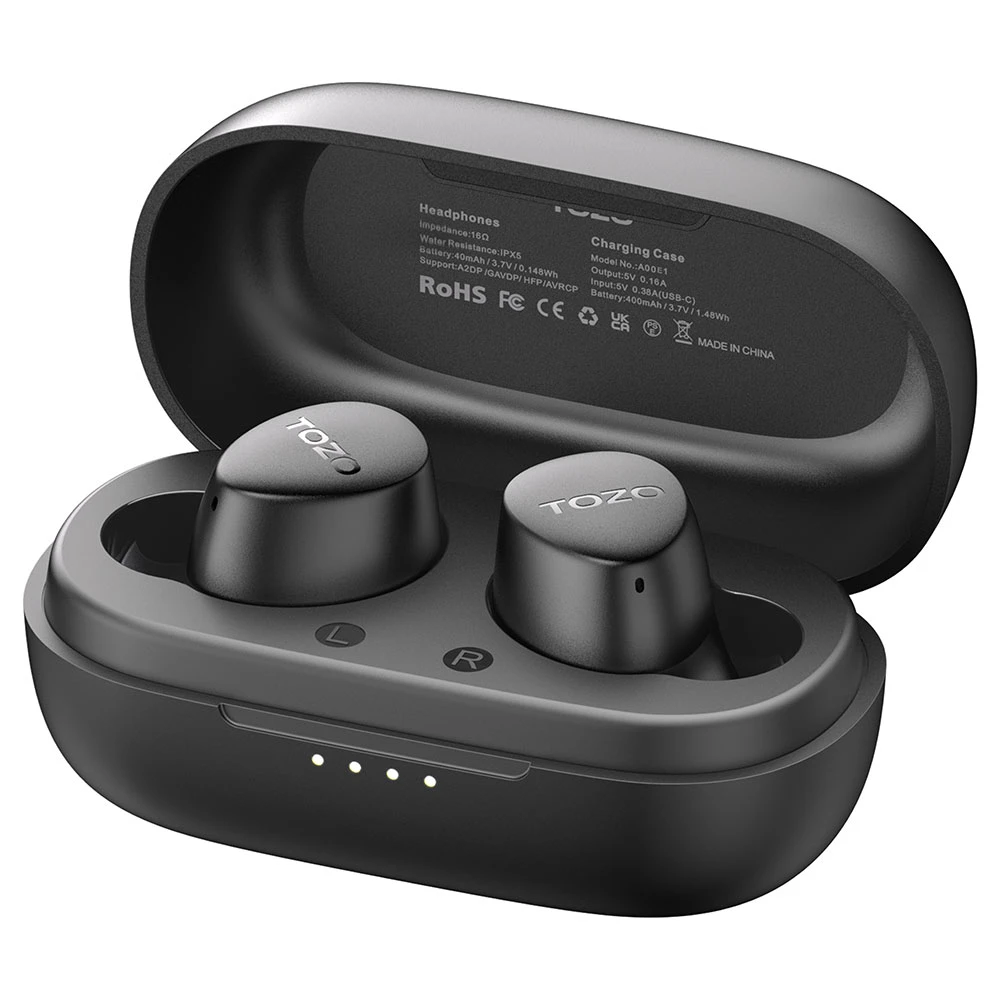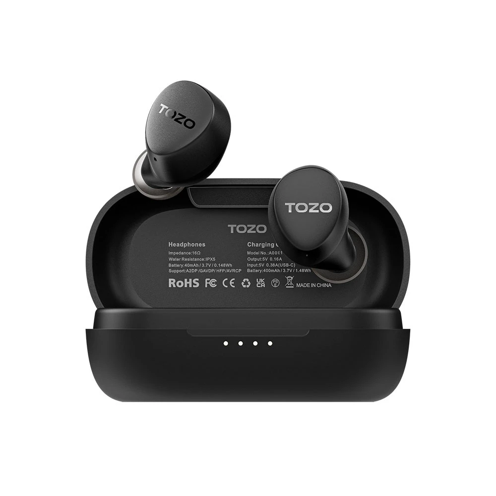 True Wireless sluchátka s technologií Bluetooth 5.3 • intra-aurální konstrukce, "špunty" • 6mm dynamické měniče pro pohlcující 3D stereo zvuk • akustická technologie TOZO ORIGX • vestavěné mikrofony • intuitivní dotykové ovládání • nízká latence pro hraní her • automatické párování • rozšiřující možnosti nastavení v aplikaci TOZO App • výdrž až 22 hodin na jedno nabití (při využití pouzdra) • USB-C • voděodolnost IPX6 • v balení tři velikosti špuntů • barva: černá