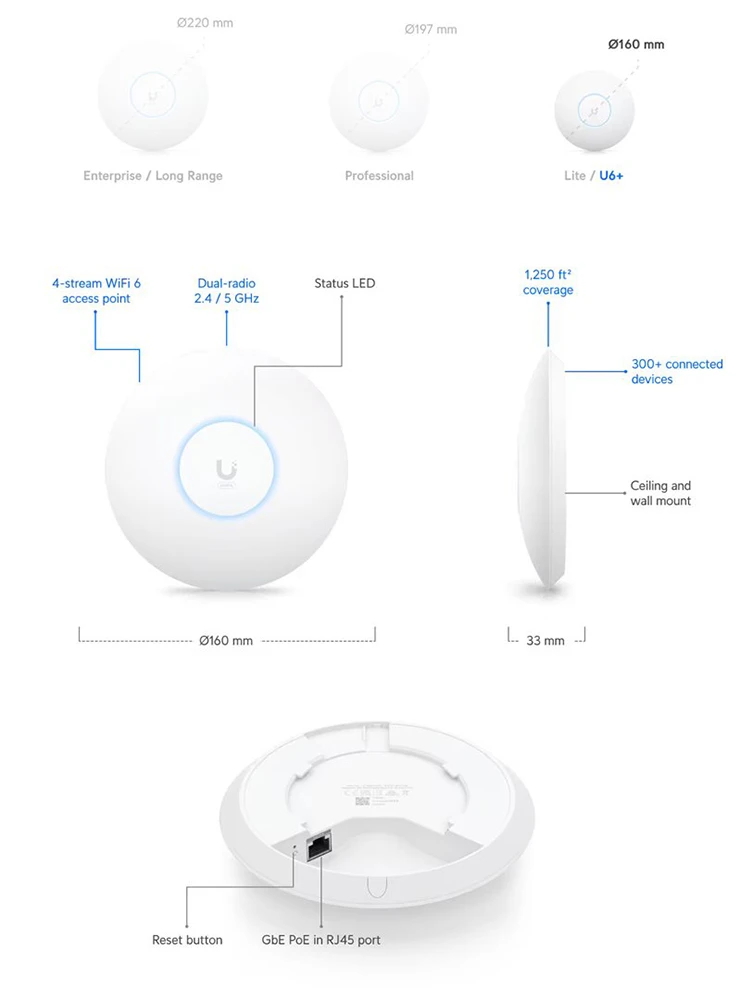 Základní přístupový bod (jednotka) UniFi 6+ je výkonný dvoupásmový Wi-Fi AP s podporou frekvenčních pásem 2,4 a 5 GHz a přenosovou rychlostí až 2,4 Gbps pro 5 GHz a 573,5 Mbps pro 2,4 GHz. Výhodou jsou malé rozměry.