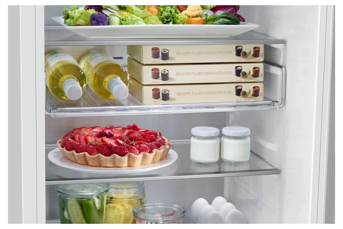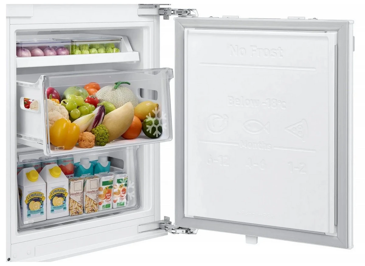 Vestavná lednice s mrazákem dole • en. třída D • objem 264 l (chladnička 190 l; mrazák 74 l) • 10letá záruka na kompresor • True No Frost • SpaceMax • Twin Cooling Plus chlazení • rychlé funkce Power Cool a Power Freeze • multifunkční police • zóna Cool Select+ • kovová deska Metal Cooling • LED osvětlení • klimatická třída: SN, T • hlučnost: 35 dB • Slide Hinge panty • rozměry: 177,5 × 54 × 51,2 cm (v × š × h)
