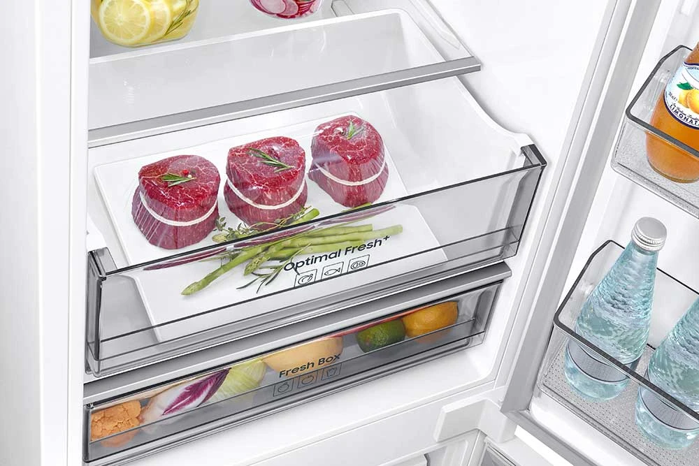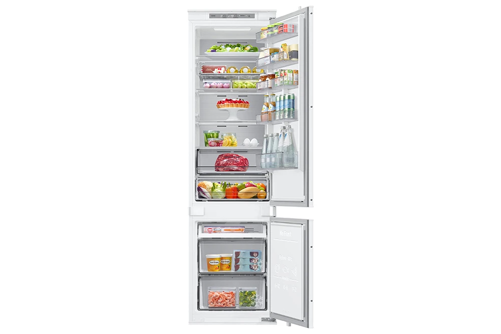 Vestavná kombinovaná chladnička • energetická třída D • kapacita 298 (224 / 74) • Twin Cooling, • technologie Metal Cooling • řešení No Frost • držák na lahve • funkce pro rychlé chlazení a mrazení • 4 police chladničky • režim dovolená • hlučnost 35 dBA • spotřeba 183 kWH/ročně • mrazící kapacita 6kg/24h • WiFi • režim SmartThings AI Energy • SmartThings aplikace • 194 cm výška