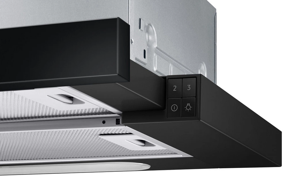 Výsuvná digestoř síře 60 cm • vrchní odtah • 3 stupně rychlosti odsávání • max. výkon odsávání: 392 m³/h • mechanické ovládání (tlačítkové) • LED osvětlení • běžná hlučnost: 71 dB • omyvatelný hliníkový filtr • tukový filtr • zpětná klapka • energetická třída: C • barva: černá
