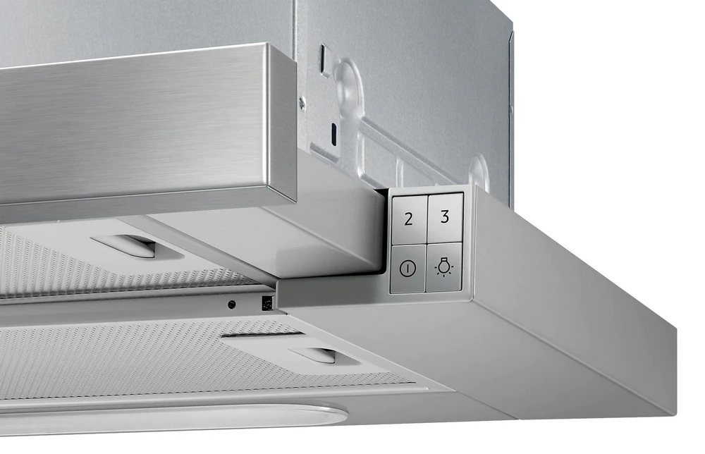Výsuvná digestoř síře 60 cm • vrchní odtah • 3 stupně rychlosti odsávání • max. výkon odsávání: 392 m³/h • mechanické ovládání (tlačítkové) • LED osvětlení • běžná hlučnost: 71 dB • omyvatelný hliníkový filtr • tukový filtr • zpětná klapka • energetická třída: C • barva: inox