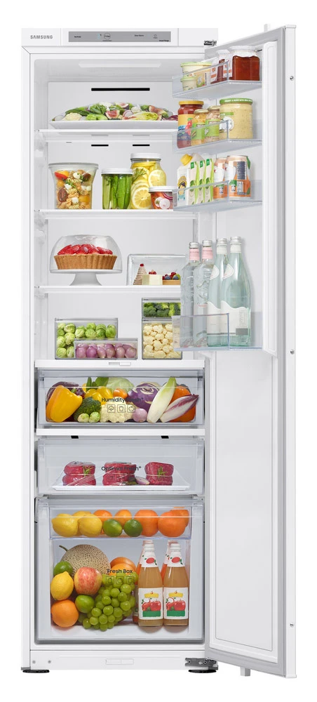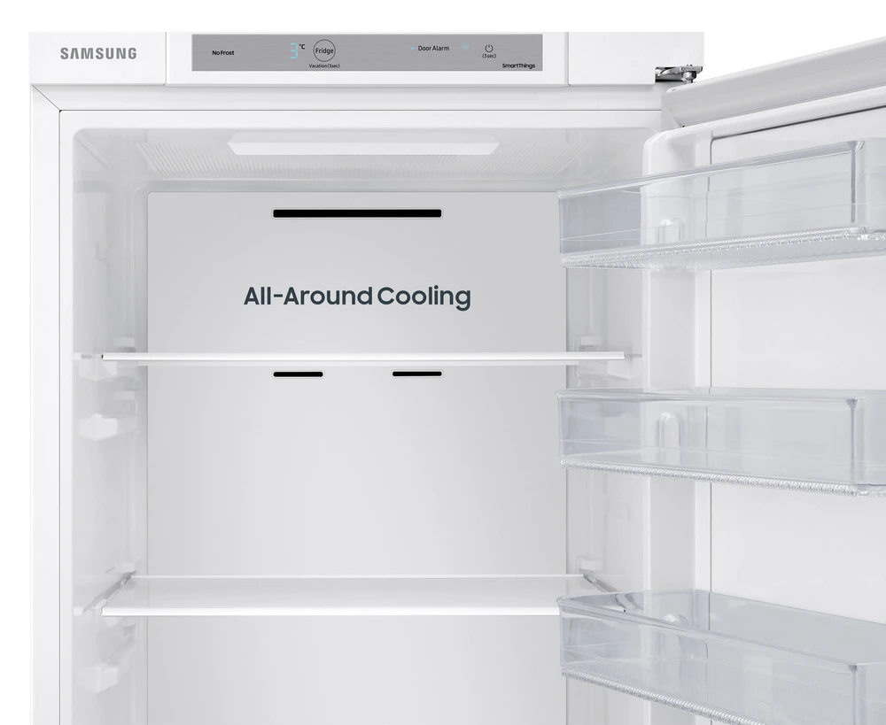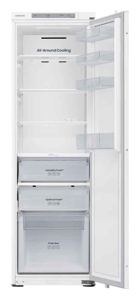 Vestavná jednodveřová lednice (bez mrazáku) v en. třídě E • objem 289 l • 20letá záruka na kompresor • True No Frost • All-around cooling chlazení • rychlá funkce Rapid Cooling • řešení SpaceMax • zabudovaná Wi-Fi • Samsung SmartThings • AI Energy Saving mód • boxy Humidity Fresh+ a Optimal Fresh+ • LED osvětlení • klimatická třída: SN-N-ST-T • hlučnost: 35 dB • rozměry: 177,5 × 54 × 55 cm (v × š × h)