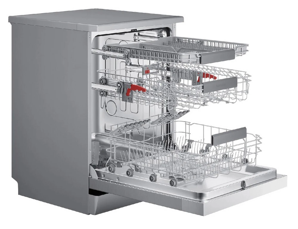 Volně stojící myčka pro 14 sad nádobí • 7 programů včetně intenzivního či expresního • Half Load – lze mýt i při poloviční či částečné náplni • horní zásuvka s nastavitelnou výškou • flexibilní kovový regál • spodní zásuvka se sklopnými přihrádkami • odložený start • funkce dezinfekce • sušení automatickým otevřením dvířek • zámek • nerezový interiér • dotykové ovládání • Aqua stop • en. třída D • hlučnost: 44 dB • rozměry: 84,5 × 65,5 × 59,8 cm (v × š × h)
