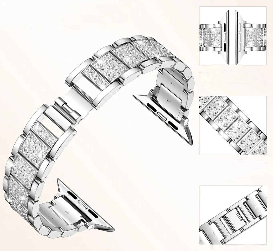 • Tento šperkový řemínek na hodinky je vyroben z vysoce kvalitních kovových materiálů, s lesklými kamínky, dobře leštěný, pevný a odolný, bez ostrých hran. Nemusíte se bát, že se vám při používání poškrábou ruce. • Snadné nastavení: Dodává se s nástrojem pro změnu velikosti. Můžete tedy snadno odstranit další články řemínku, aby se hodinky perfektně přizpůsobily vašemu zápěstí. • Kompatibilita: pro iWatch pro řadu 8/7/6/SE/5/4/3/2/1 a velikost 42 mm 44 mm 45 mm