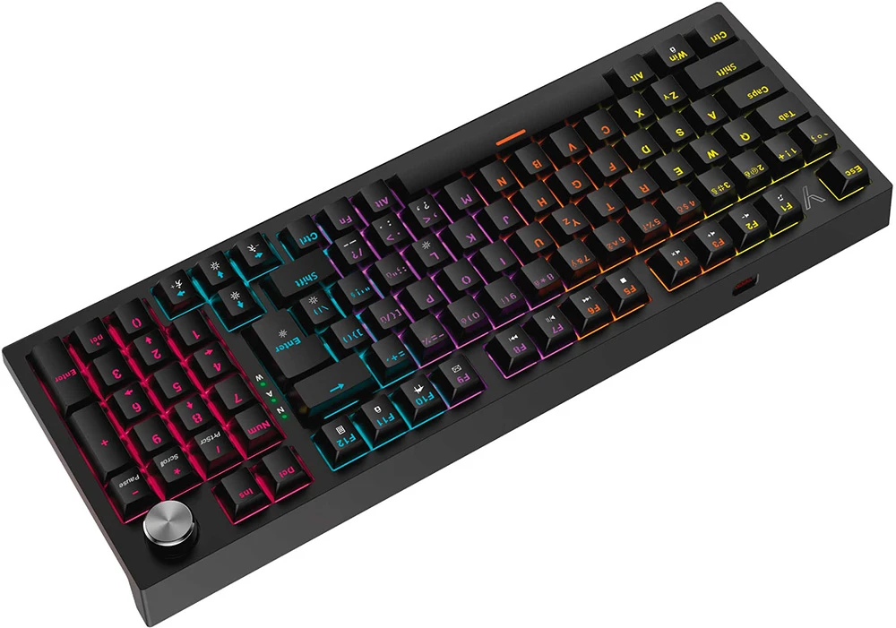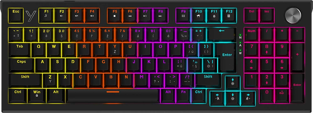 Herní mechanická klávesnice APEX • kompaktní layout s numerickou klávesnicí • ovládání hlasitosti a médií kolečkem • mechanické spínače Outemu Red • technologie gasket-mount • 17 režimů barevného podsvícení RNBW • délka kabelu: 1,8 m (vyměnitelný, pletený USB-C součástí příslušenství)