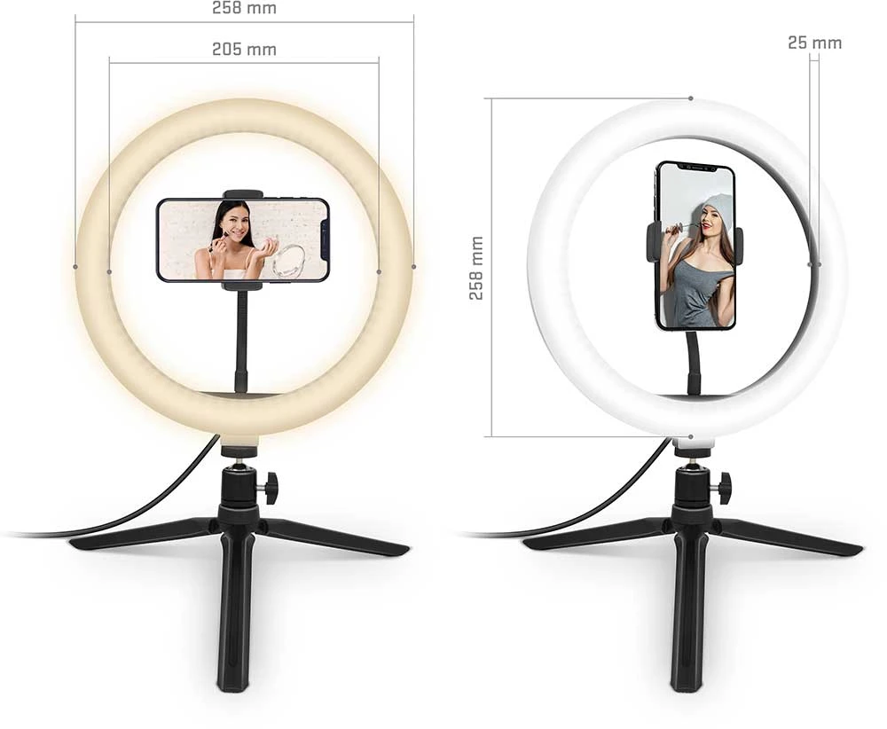 10" LED kruhový držák mobilního telefonu • dálkový ovladač • Bluetooth selfie spoušť • 29 barevných variant podsvícení • 3 základní odstíny bílé (studená, neutrální, teplá) • 13 statických a 13 dynamických RGB barevných variant 8 úrovní jasu • možnost polohovat a otáčet o 360° • natáčejte videa a streamujte na sociláních sítích • vždy výborné světelné podmínky pro natáčení a focení • vhodný pro mobilní telefony do šířky 80 mm • napájení přes USB-A konektor
